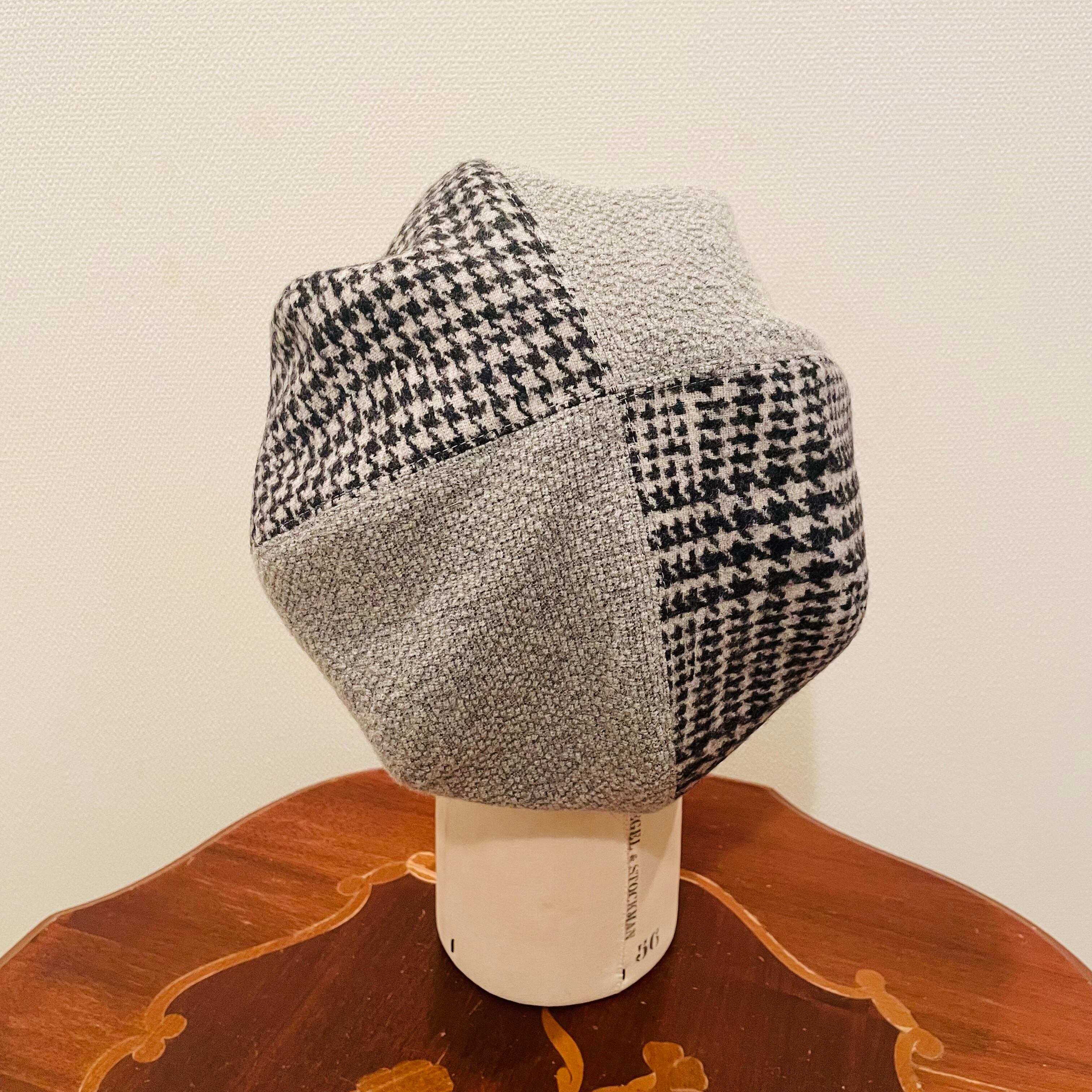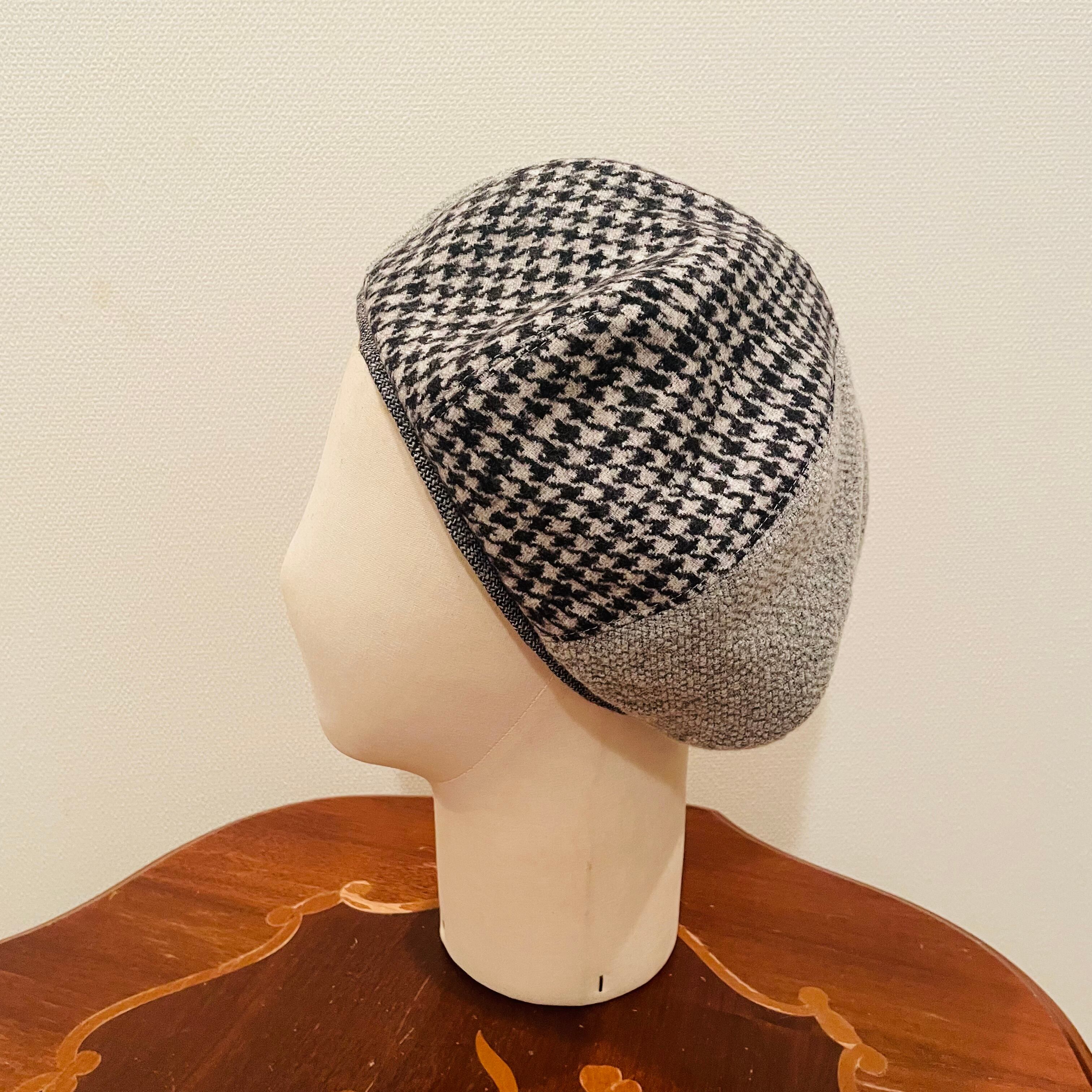コロンとした4枚はぎベレーは、シンプルながらも可愛いマッシュルームシルエットが見る者を惹きつけます。プツプツっと凹凸のあるアルパカウールのニット地と、千鳥模様が特徴のウールです。