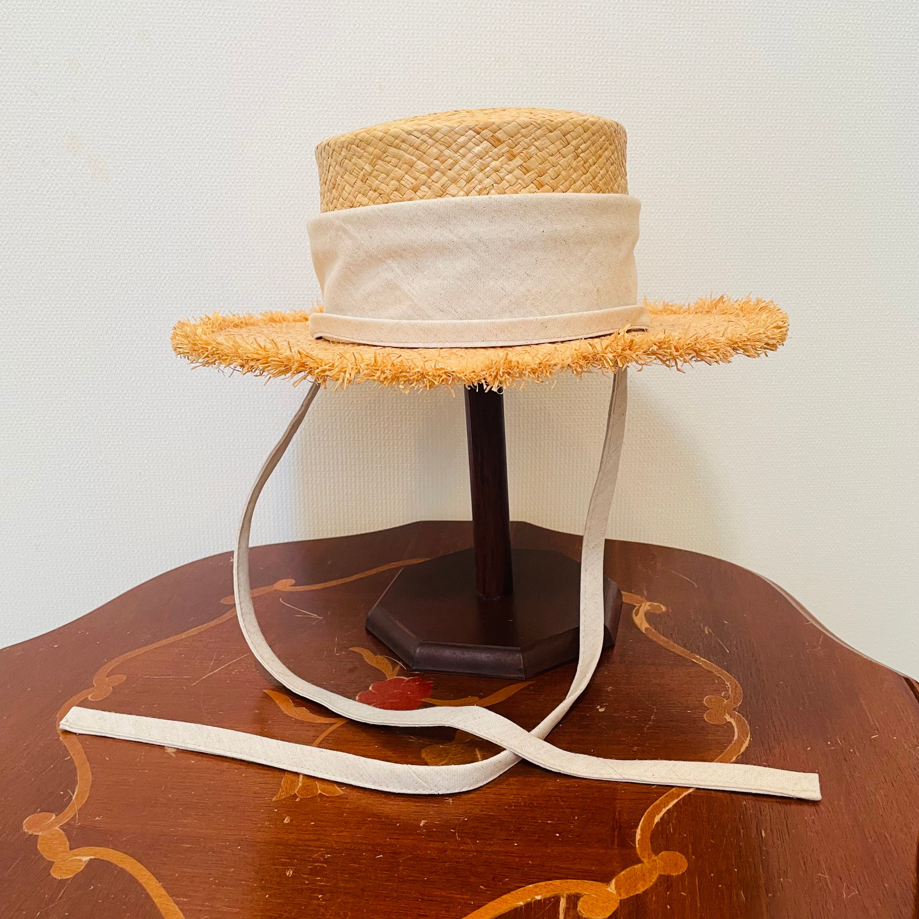 このハットの特徴は、フラットなトップクラウンと水平なブリム。クラウンが丸みを帯びていても、ブリムが水平ならボーターハットの粋なスタイルをキープします。
