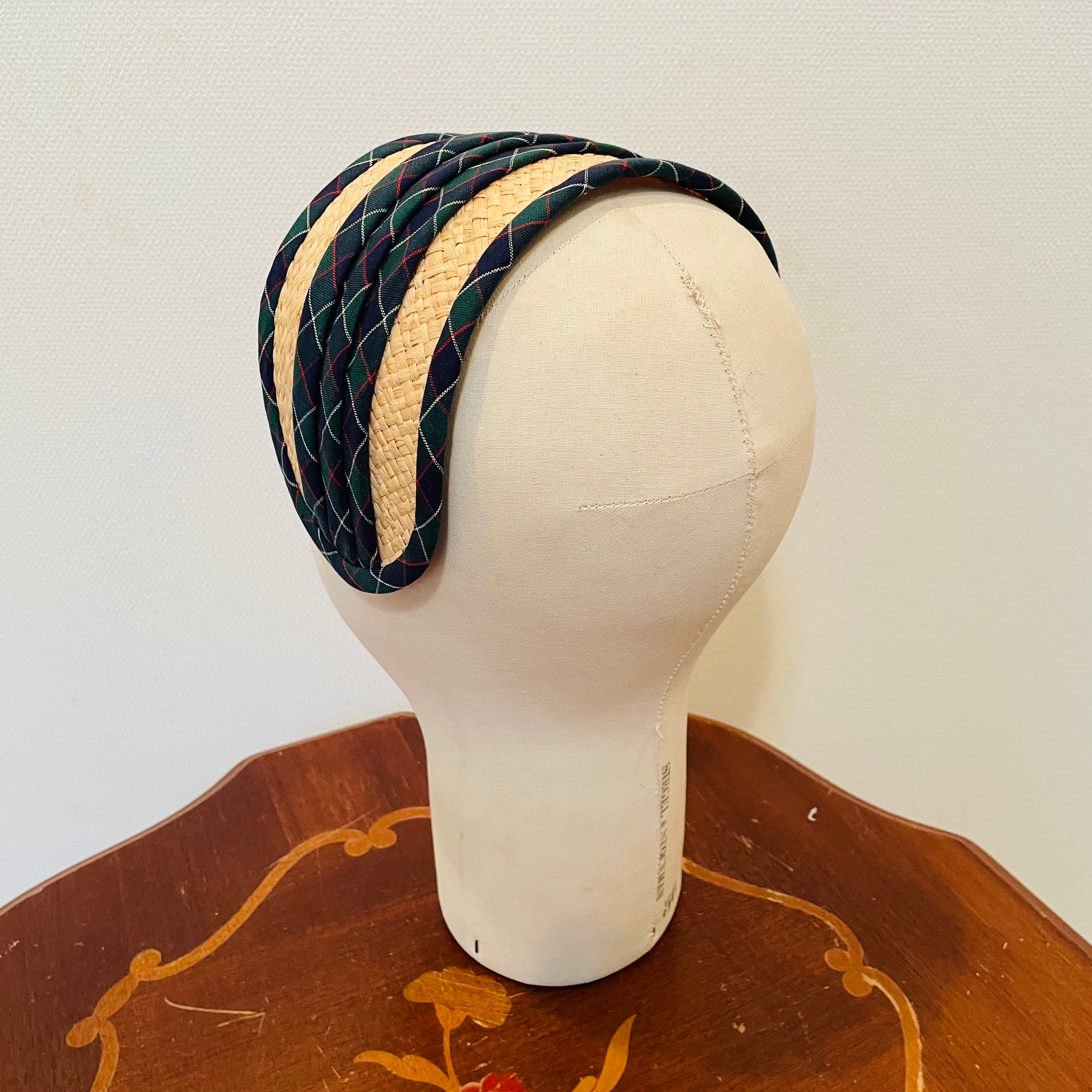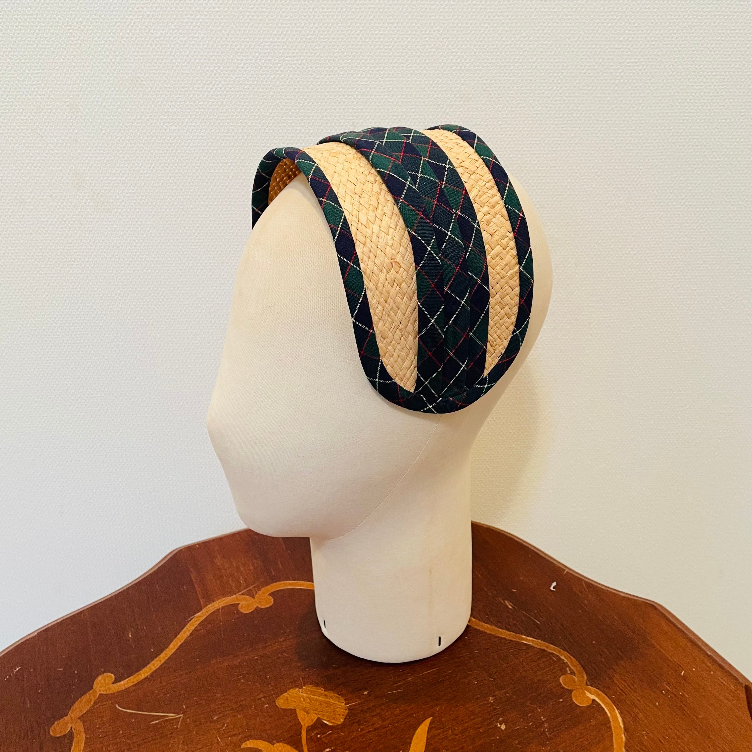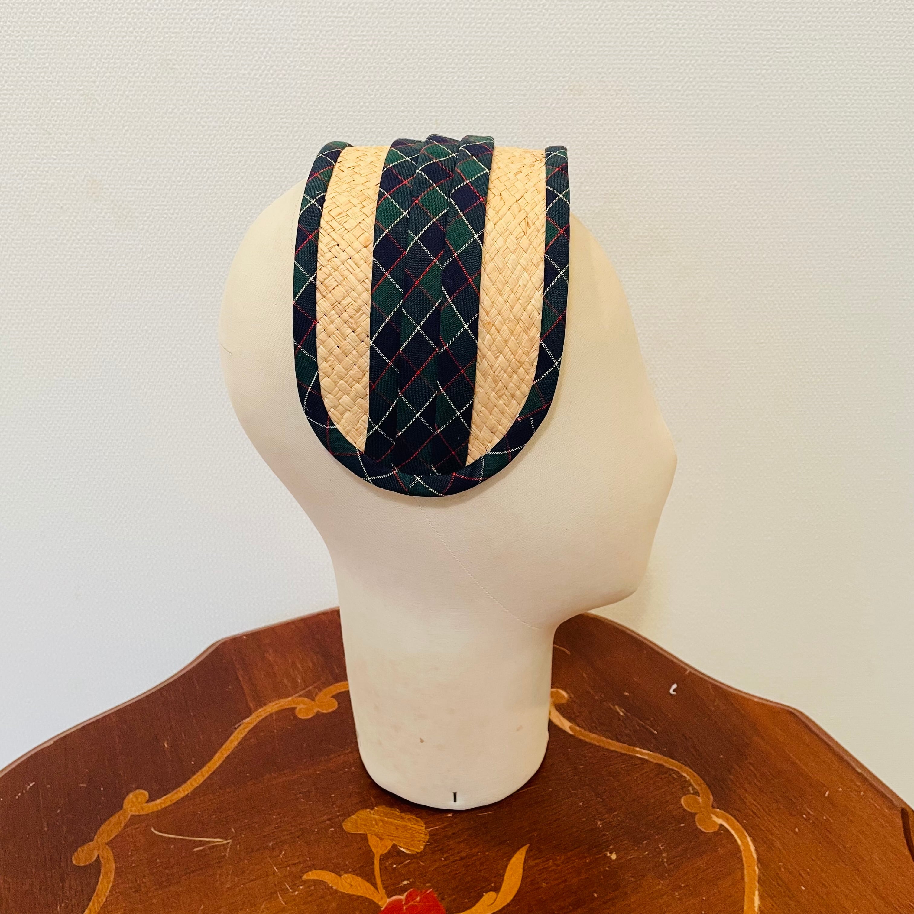 上質なラフィアストローとクラシックなチェック柄が調和した、幅広のヘッドバンド。