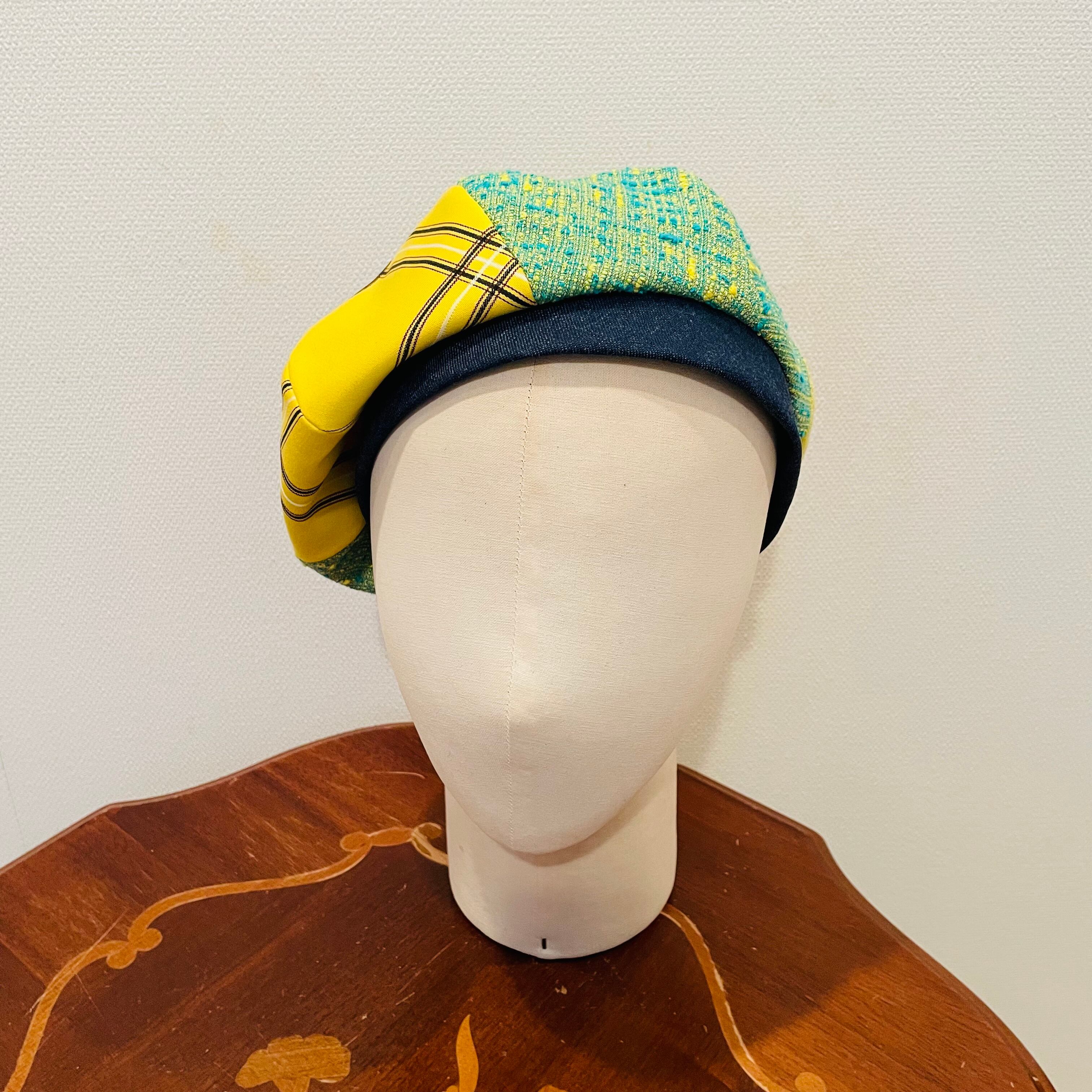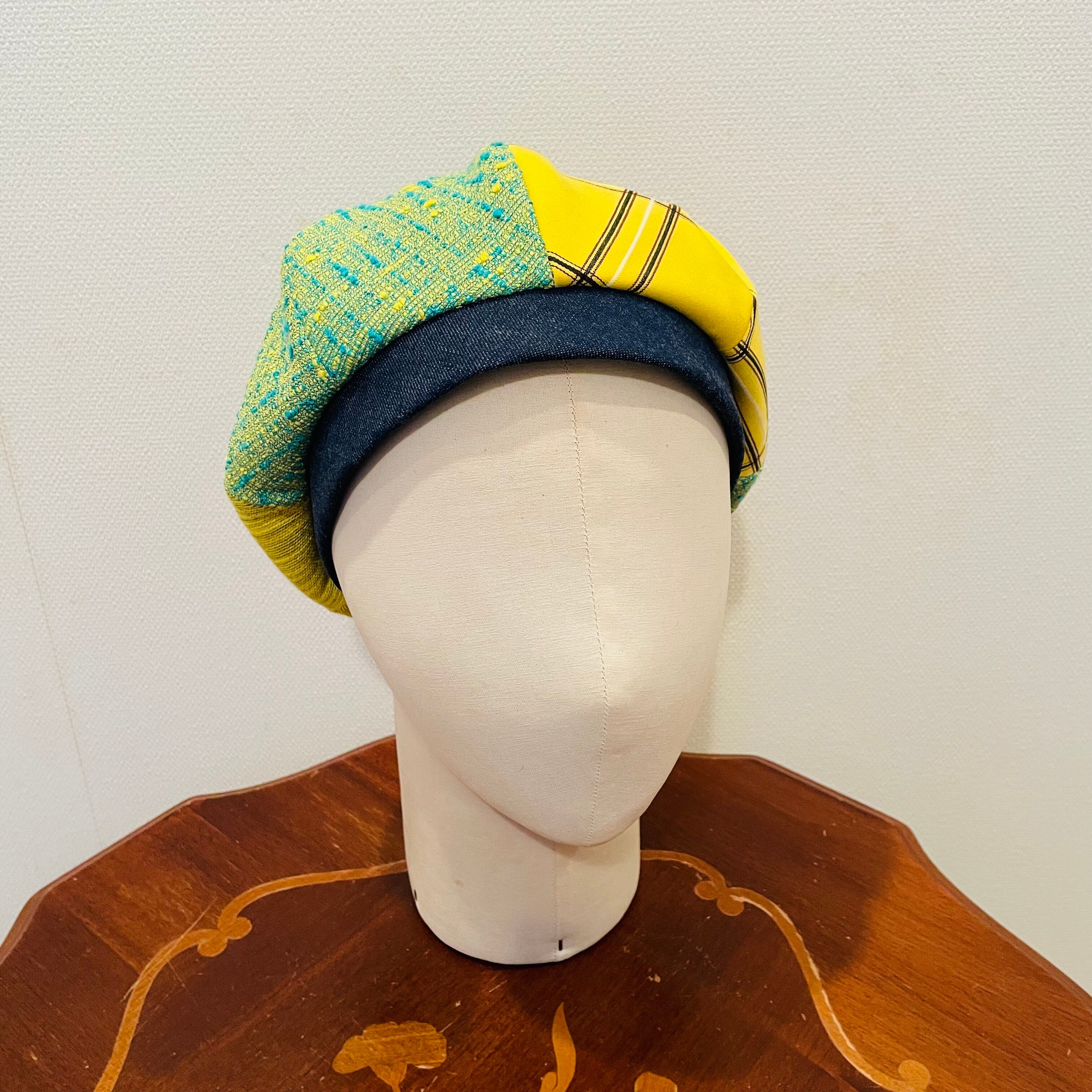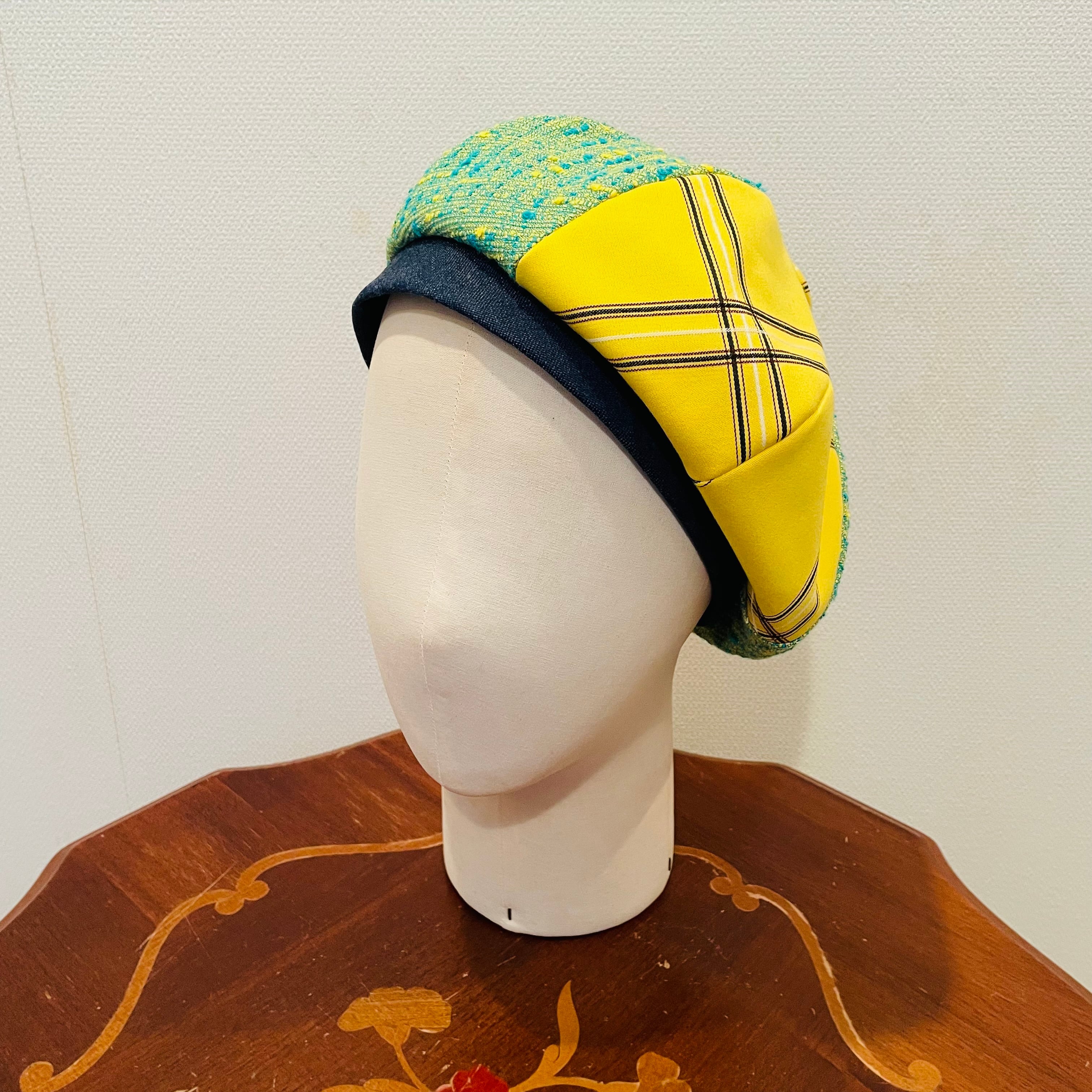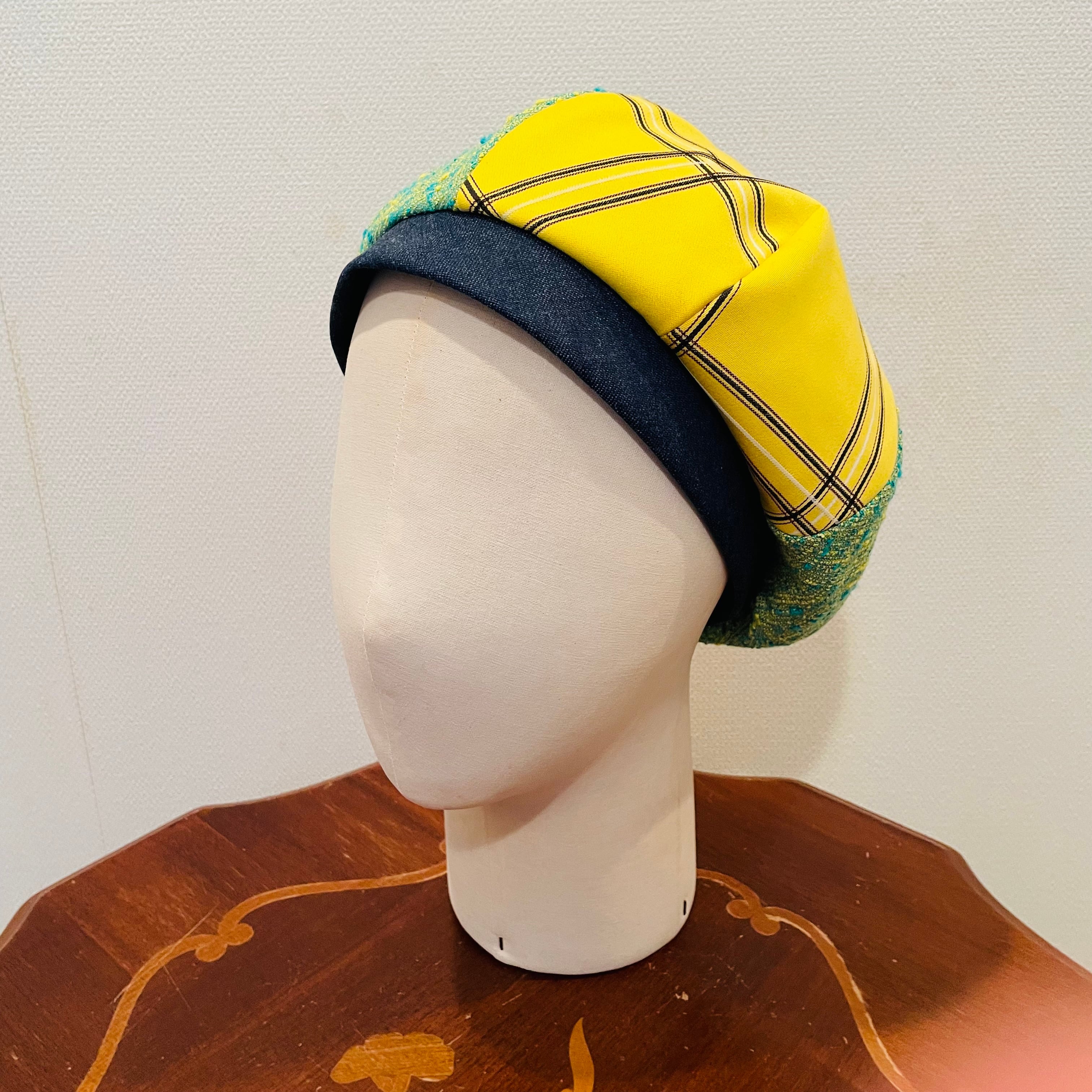 230 4枚はぎベレー・デニム飾りバンド / イエローチェック 包みボタン付き