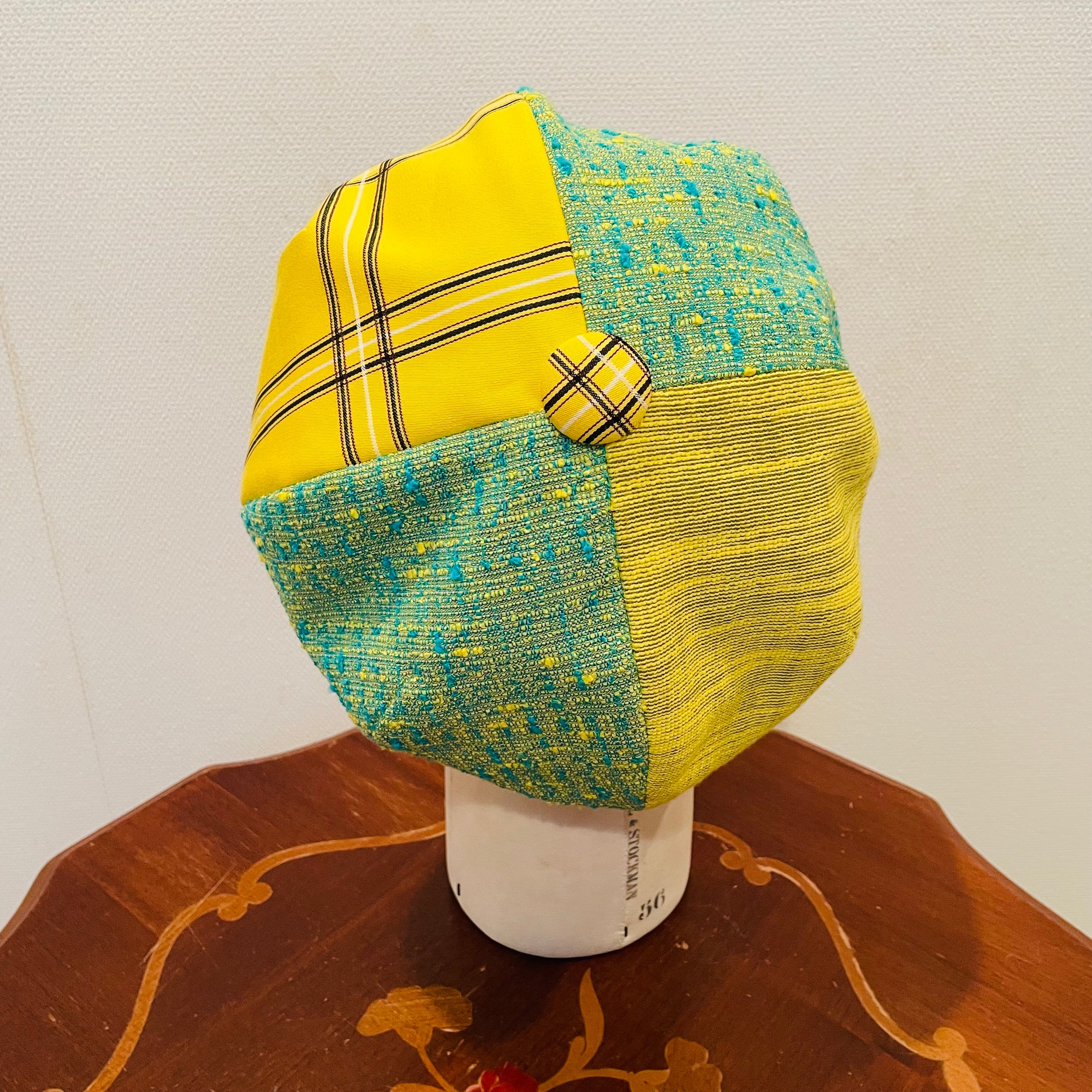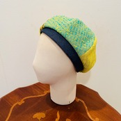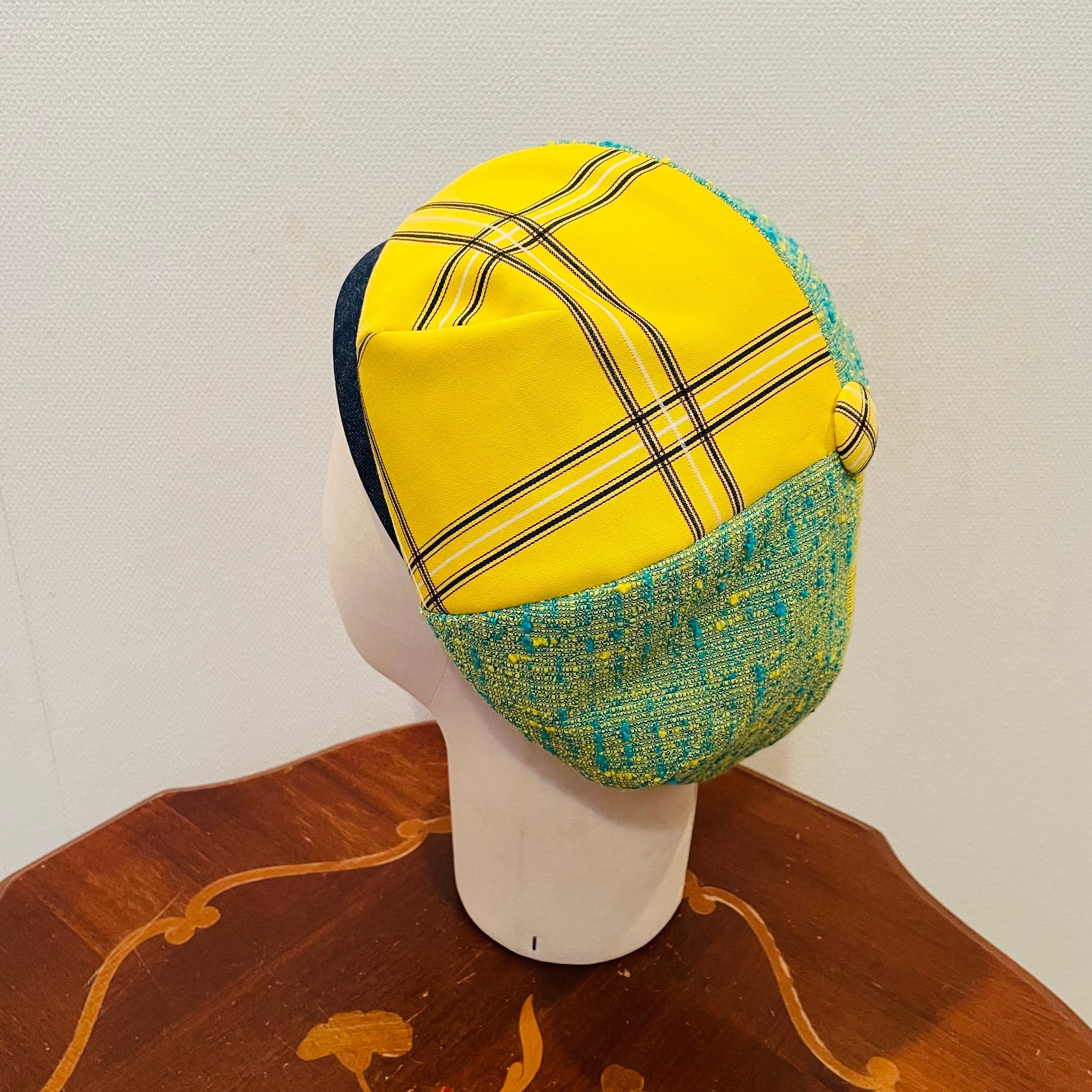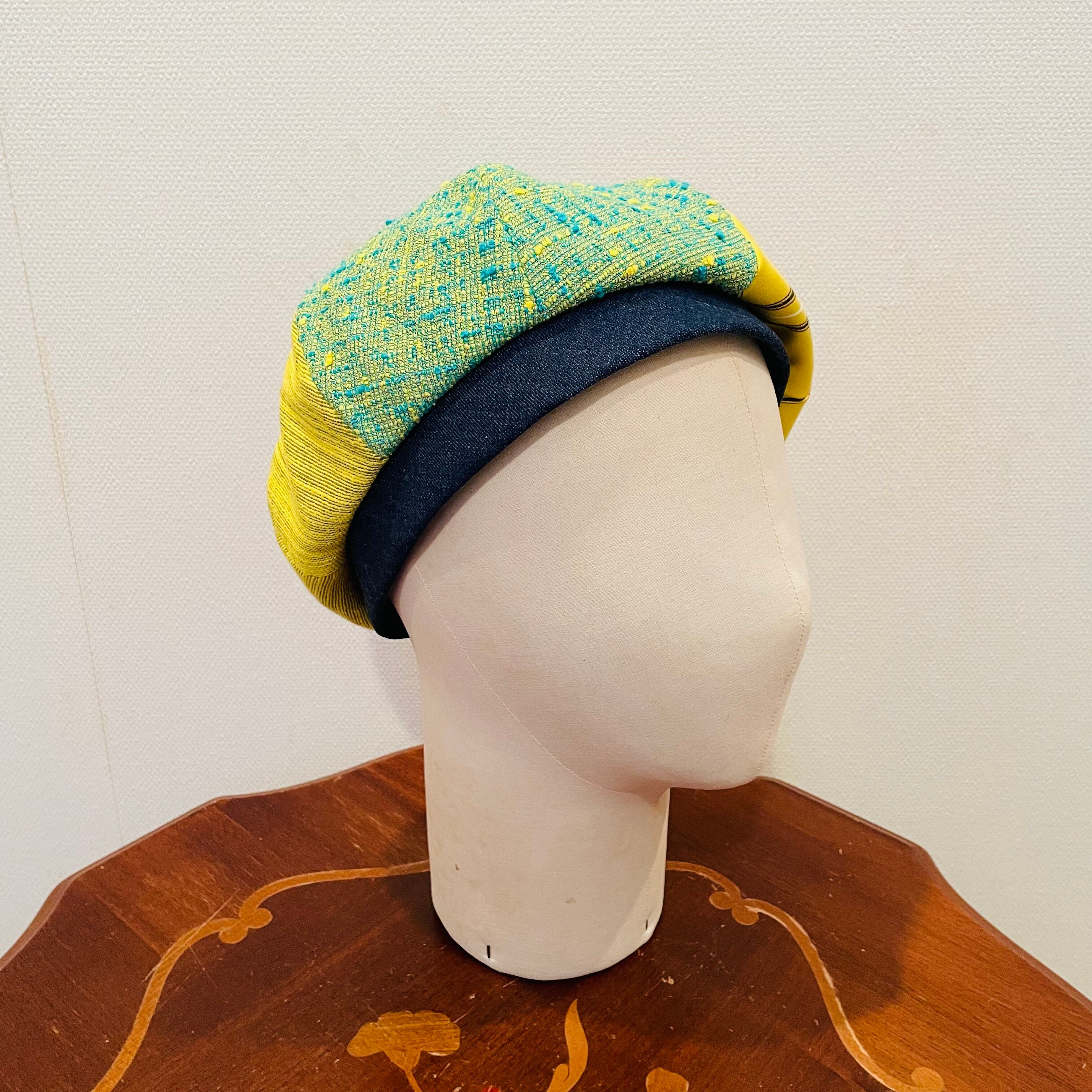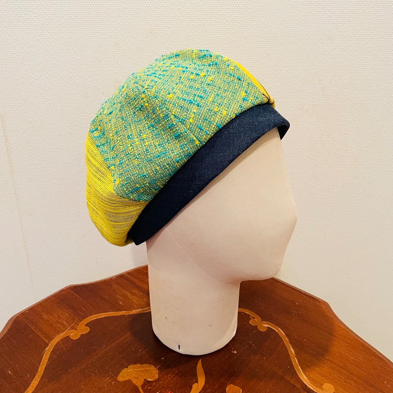 230 4枚はぎベレー・デニム飾りバンド / イエローチェック 包みボタン付き