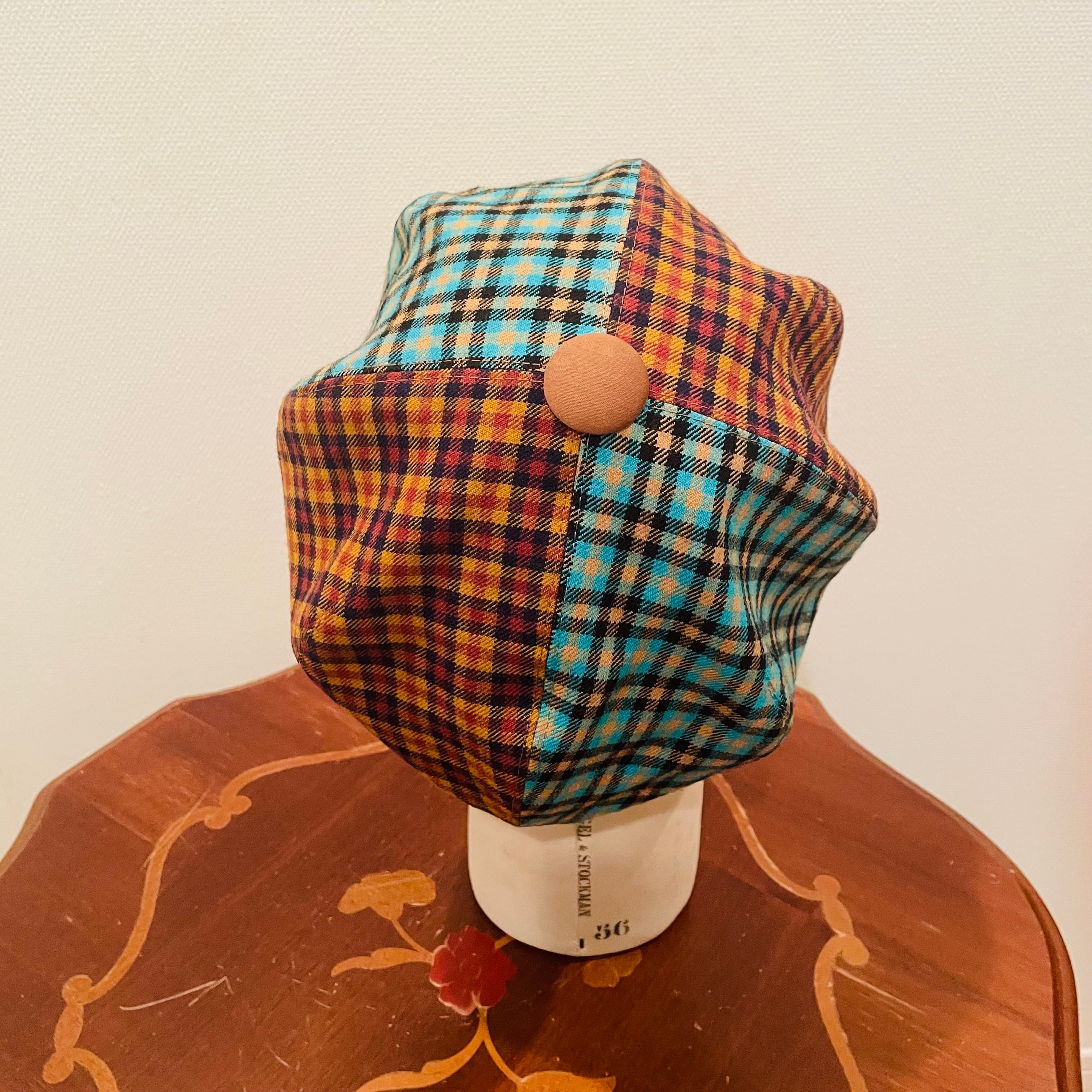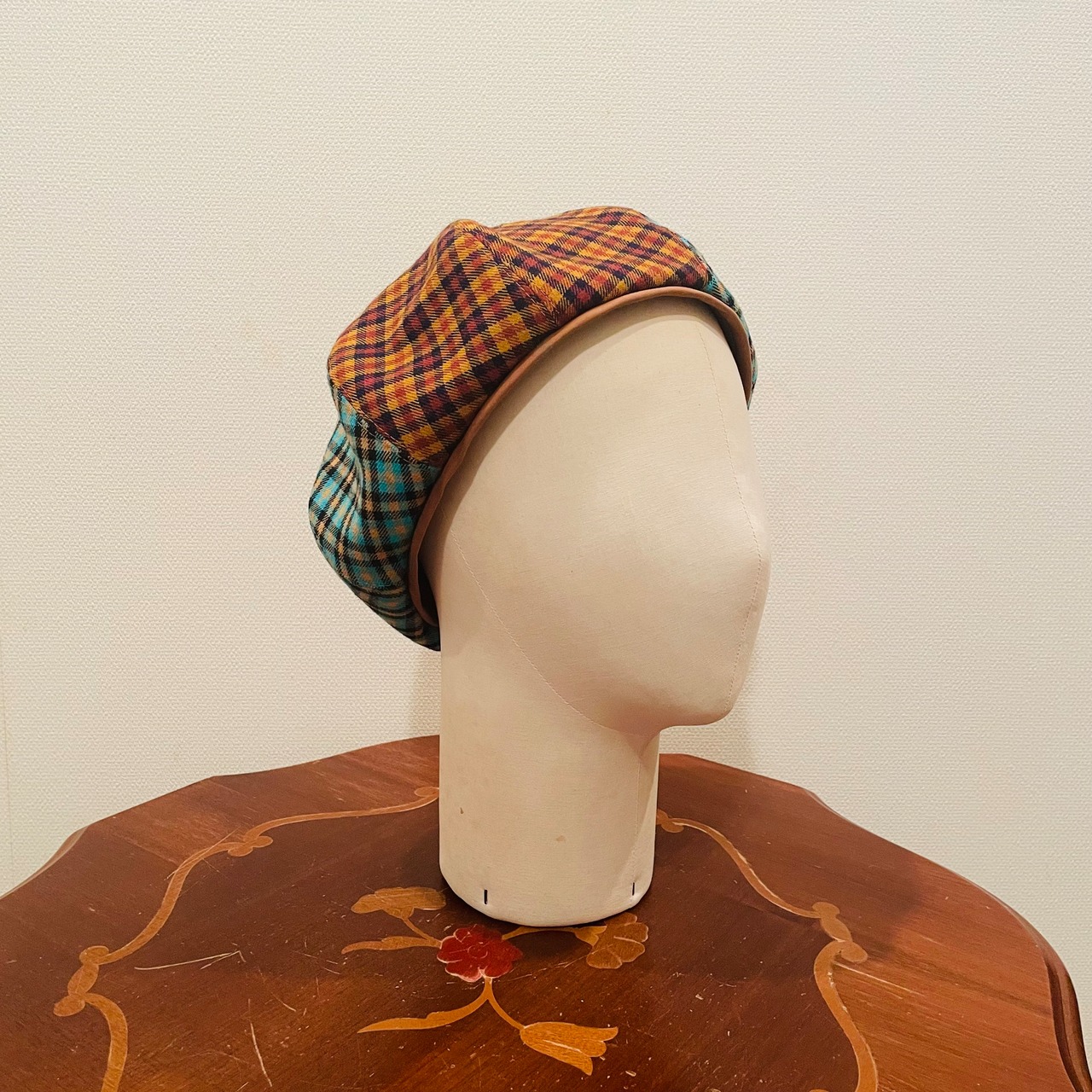 温かみのあるブラウンと爽やかなミントグリーンのチェック柄が織りなす、秋冬に映える一品。コロンとした愛らしいシルエットが頭を優しく包み込み、どんな装いにも洗練されたアクセントを添えます。